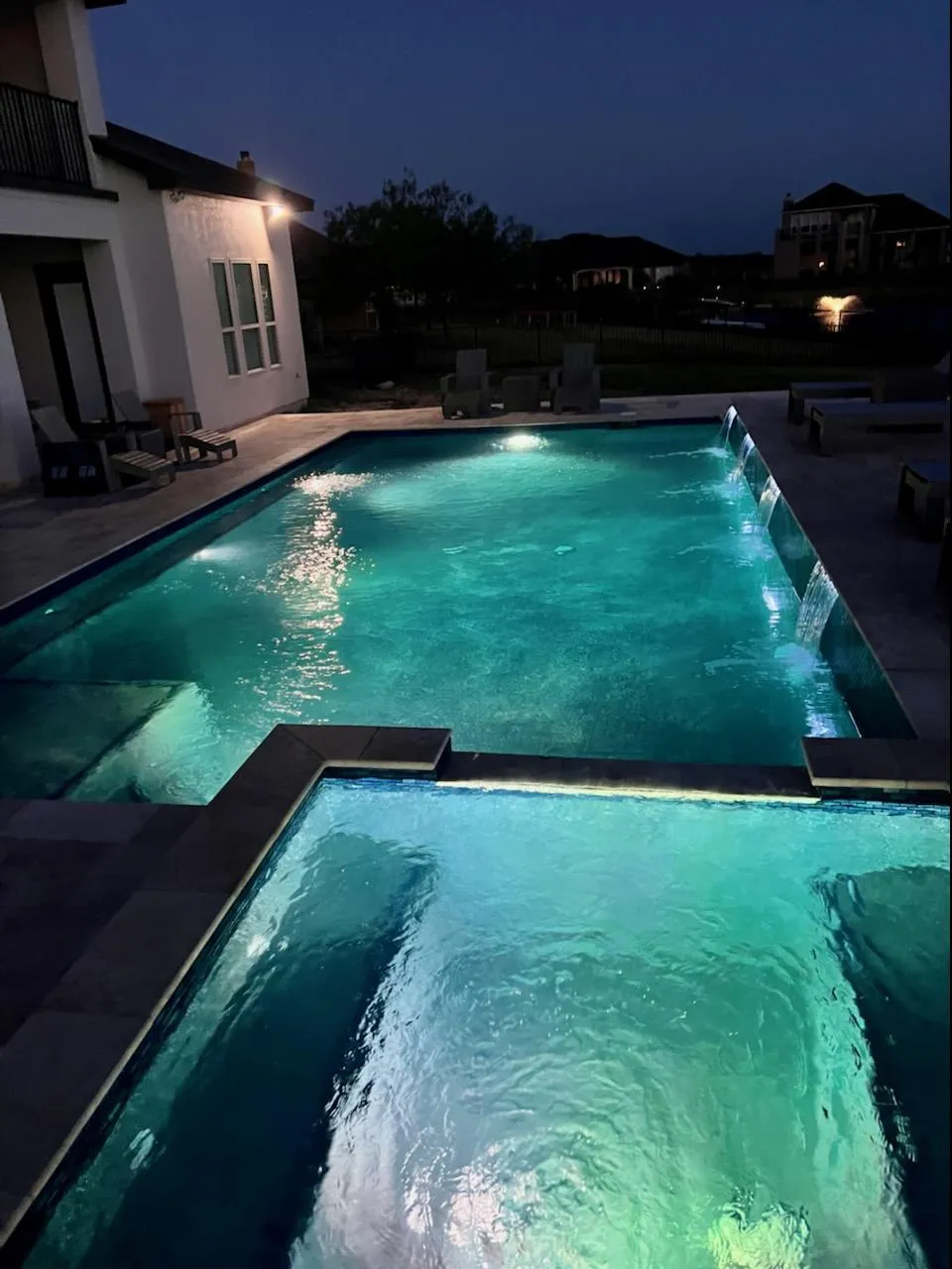 We specialize in custom concrete pools, including freeform and geometric designs. We can also incorporate features like tanning ledges, water features, custom lighting, and integrated outdoor living elements.